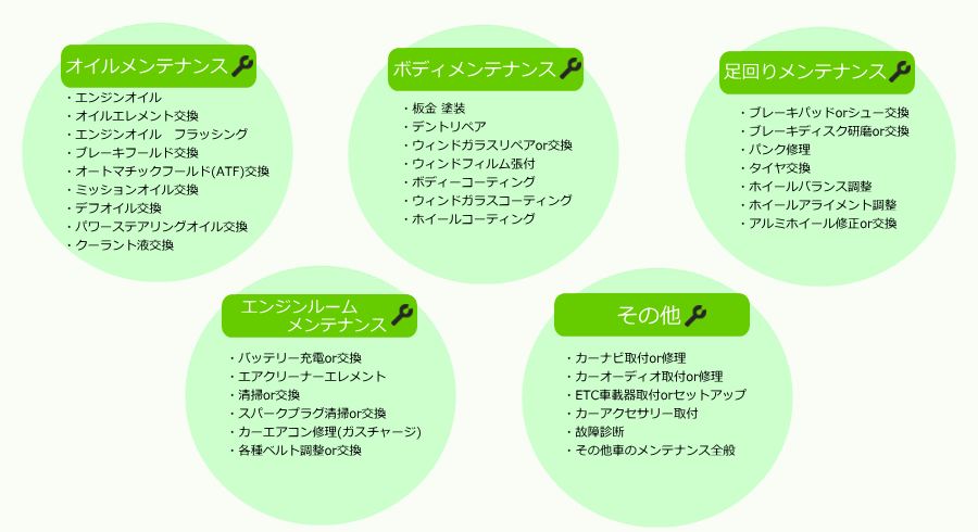 以下のとおり豊富なメニューを取り揃えていますので、お気軽にご相談ください。もちろん当社で購入されていないお車も大歓迎です。